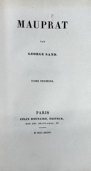 ![]() G. サンド 『至上の愛』 全2巻 初版 初刷 1837 MAUPRAT Paris: Felix Bonnaire & Victor Magee. 2 vols.set. First edition, first printing, with publishr's 16p catalogue, original wrappers, all edges untrimmed, large 8vo, with slip-case and Bradley Martin's Ex-libris, a good copy. 1837 ¥45,000 |