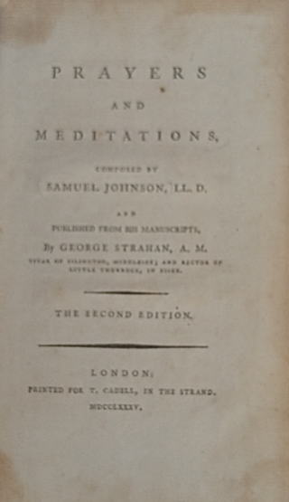 | 1141 | JOHNSON, Samuel (Composed) PRAYERS AND MEDITATIONS. London: T.Cadell. Second edition,half brown calf, xiv+234pp, clean copy. 1785 ¥ 45,000 |